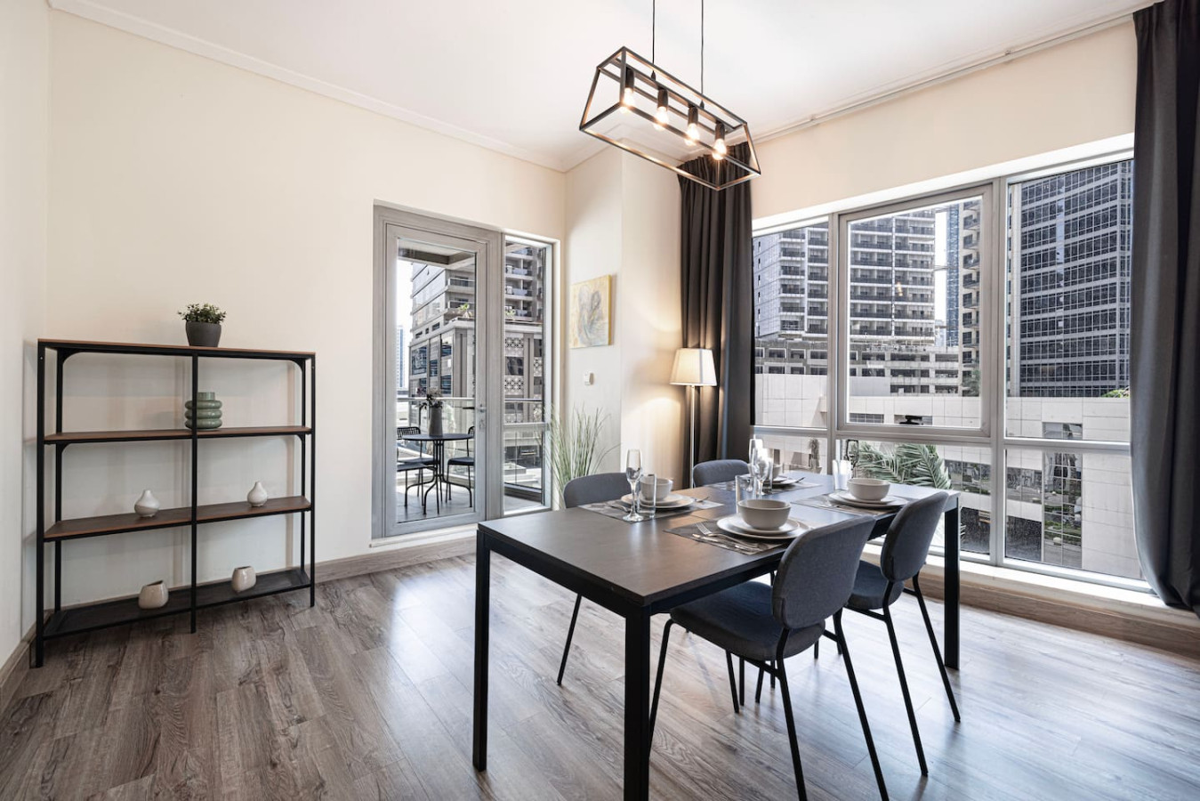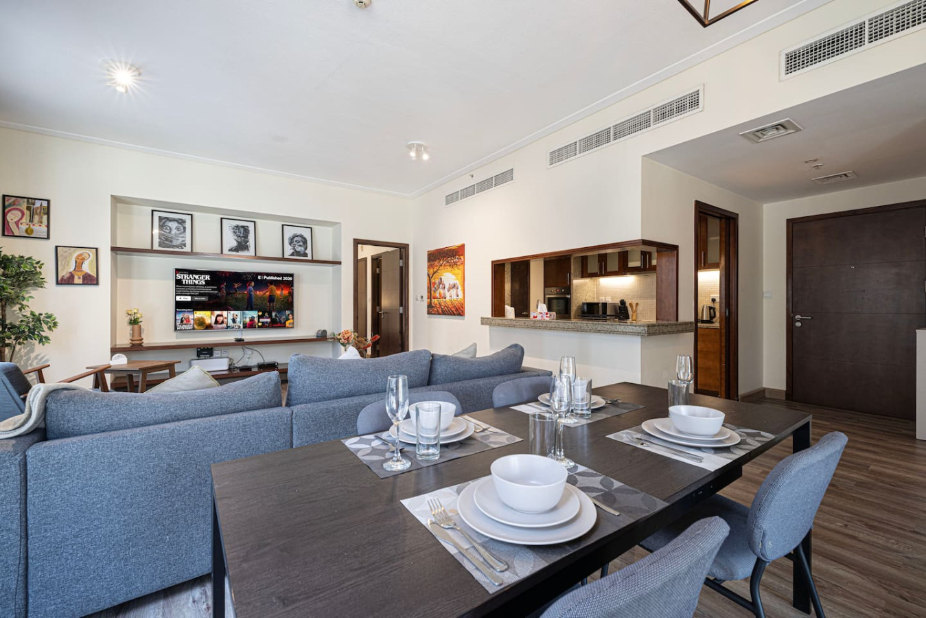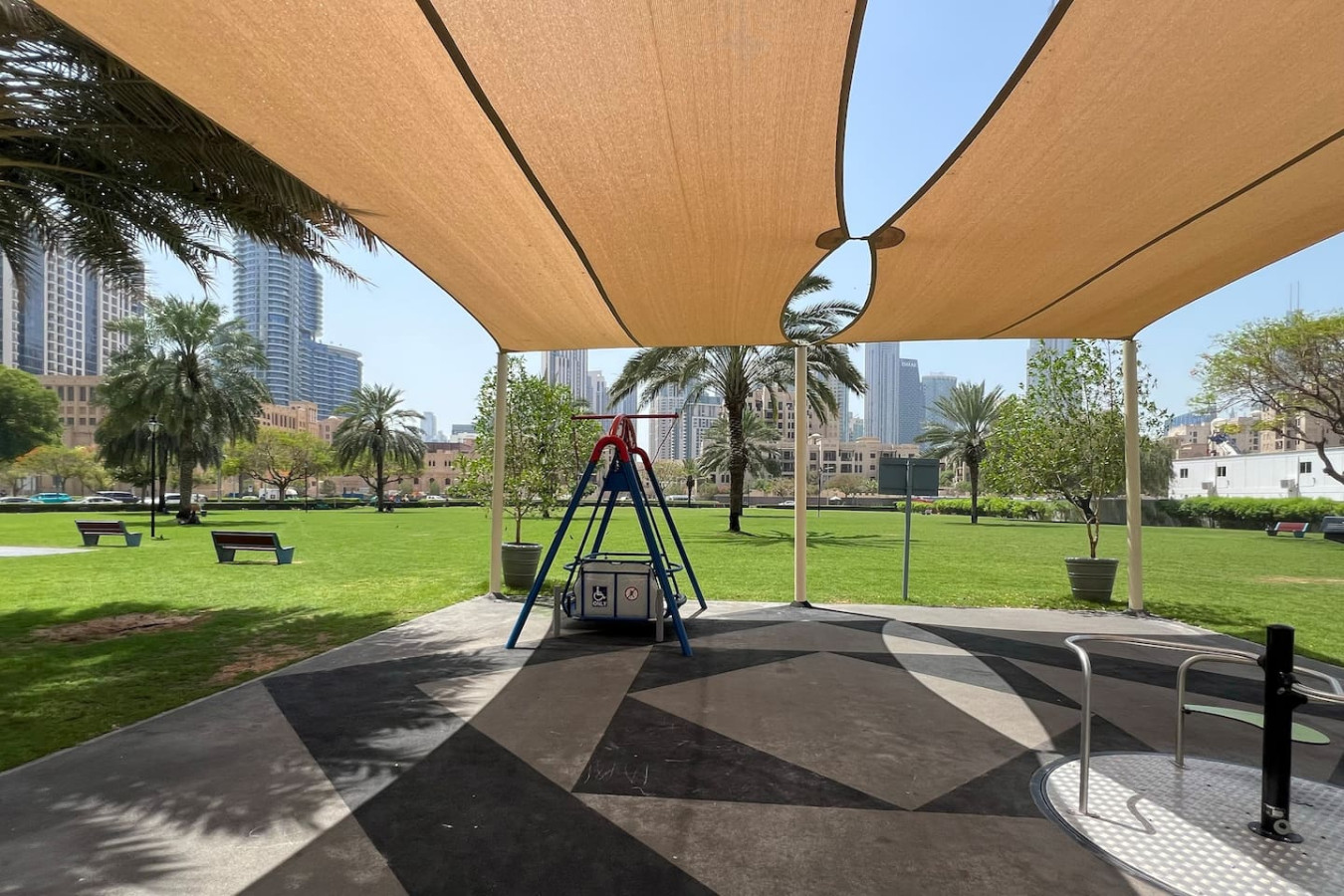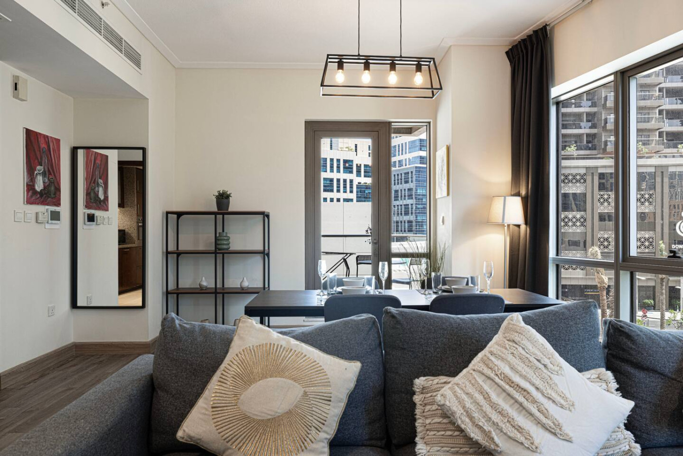 If you're looking for a modern newly furnished and comfortable apartment in Downtown Dubai, this is the one for you! Located centrally in the heart of Downtown & BLVD you will be in close to Dubai Mall, Burj Khalifa & Dubai Opera in the South Ridge tower 4. You will enjoy easy access to everything from this centrally located place. – 5 minutes walk from Dubai Mall – 5 minutes walk from Dubai Mall metro Station – supermarkets in the building Enjoy Dubai Our spacious 1-bedroom Dubai apartment is furbished with lovely furniture and decorations would undoubtedly make you feel at home This place is naturally w ell-lit, Sit back and lounge on the comfy couch while being entertained by the wall-mounted Cable TV. This area comes complete with a Soft rug, wooden center table, indoor plant & pendant light. Cook your meals in the fully functional kitchen equipped with a stove, microwave, toaster, kettle, coffee maker, fridge, cutleries, cookware, and dishwasher. Serve the meal and dine in together with your loved ones on this beautiful wooden dining table paired with 4 upholstered dining chairs. Munch your morning breakfast or evening snacks on the kitchen counter As you walk your way to the bedroom you will be welcomed with a King-sized bed fitted with fresh linens, soft pillows, and a cozy mattress to help you sleep better. The room comes complete with side lamps, wall art, vanity space & a sofa with a TV. The bathroom is packed with soft towels, shampoo, conditioner, shower gel, and body lotion. – One bedroom with king bed – Living Room with Sofa Bed and Sofa – Large living area/dining area – Large smart TV in the living room – Fully equipped kitchen – Brand NEW high-end GYM – Indoor children's play are Only a short walk away from Dubai Mall, the Fountain Show, The Boulevard and the Burj Khalifa herself – you are sure to enjoy your time in this exquisite apartment in the South Ridge 4 tower. We look forward to hosting your stay! Guests have full access to pool, gym and parking for free. we are always available to support face to face or over the phone . In the heart of Dubai Down Town across the street from Burj Khalifa – South Ridge 4 tower Metro or taxi or bicycle or you can also rent a scoter *Please note that there is a charge of AED 500 for each lost access card or set of keys **Please be advised that smoking inside the apartment is strictly prohibited with fine of 500 AED .