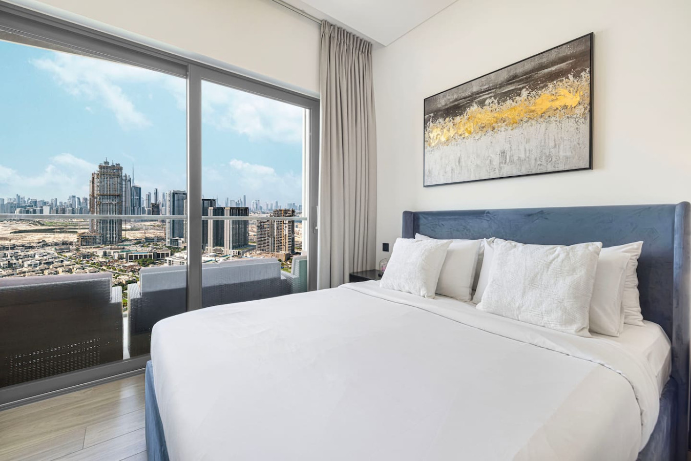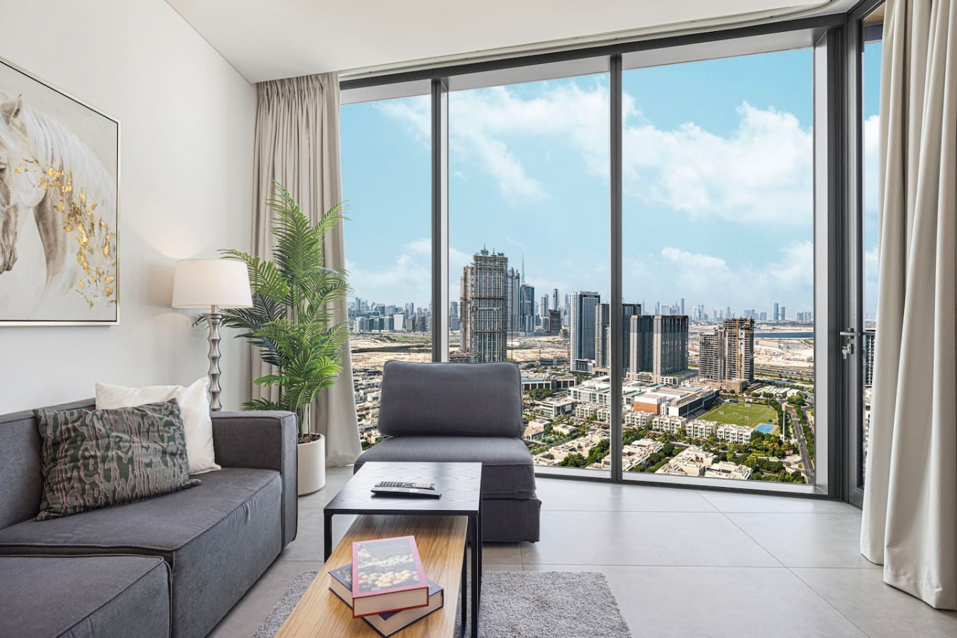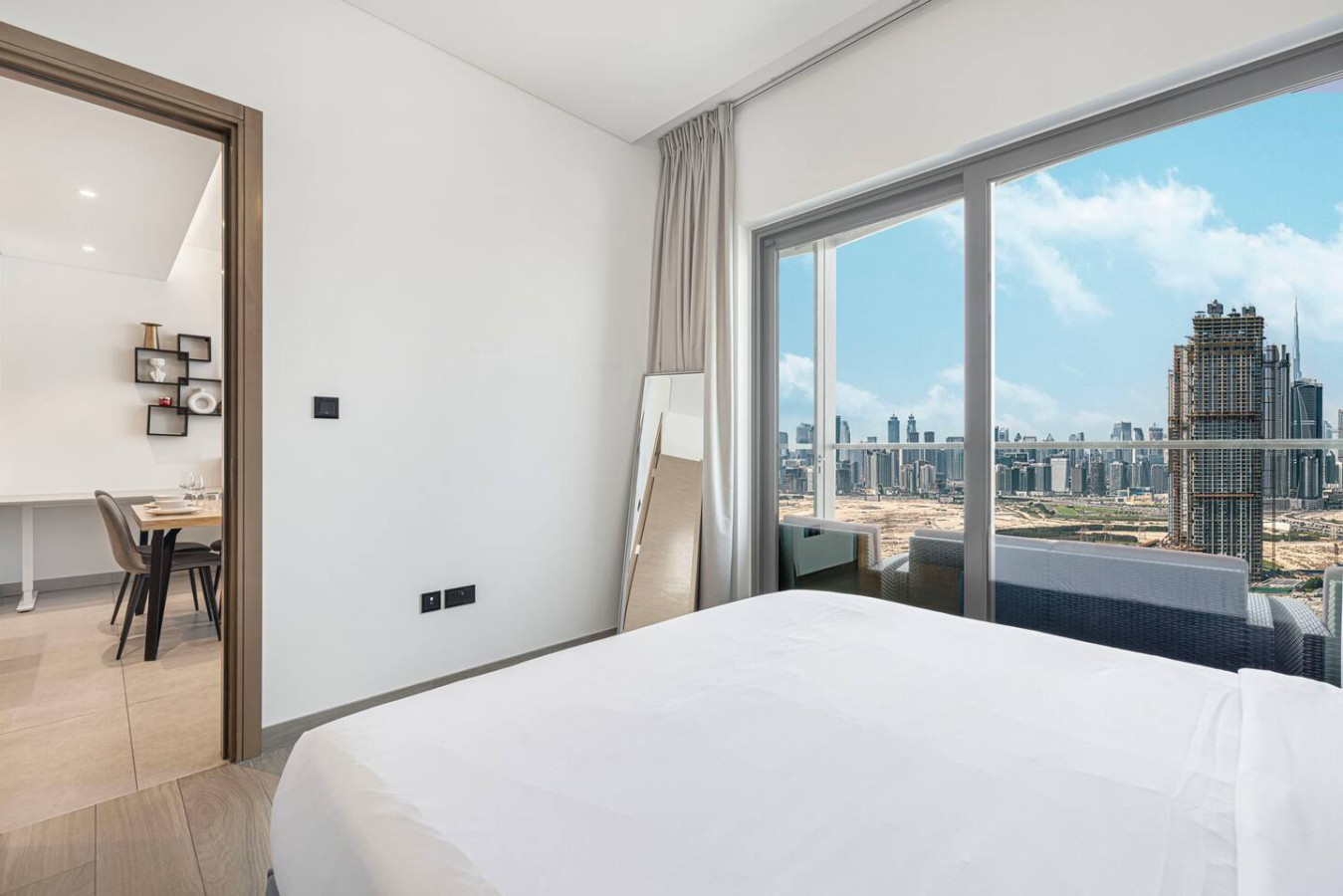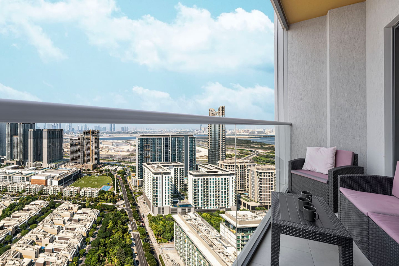 Welcome to your home away from home in the heart of Dubai. This elegant 1-bedroom apartment with single sofa bed in the living room, in the prestigious Waves Grande at Sobha Hartland blends modern comfort with resort-style amenities, creating the perfect stay. Enjoy a fully equipped kitchen, and a cozy bedroom for restful nights. Dive into the infinity swimming pool. Its ideal location provides easy access to key parts of the city. Everything you need right at your doorstep. Welcome to Dubai Home sleep 3 adults+1 child at 33rd floor with uninterrupted, panoramic views of the Dubai skyline. Fully equipped kitchen comes with completely stocked cooking needs including selection of pots, pans, serving dishes, platters, cookie trays and more, refrigerator, oven, sink, dishwasher, microwave, kettle. Our spacious 1-bedroom Dubai apartment is furbished with lovely furniture and decorations would undoubtedly make you feel at home – Brand new furniture and appliances – One bedroom with king bed – Living Room with Sofa Bed and Sofa – Large living area/dining area – Large smart TV in the living room and the bed room – Fully equipped kitchen – Brand NEW high-end GYM – Indoor children's play are – Large balcony -Full amenities, towels, shampoo, coffee, water, tea provided ect. -High Speed internet -Parking space – Two pools with kids play area and Sauna and Gym with free access welcome to Dubai 🙂 Guests have full access to pool, gym and parking is on request in the building. We are always available to support face to face or over the phone . Meydan area Taxi or by walk