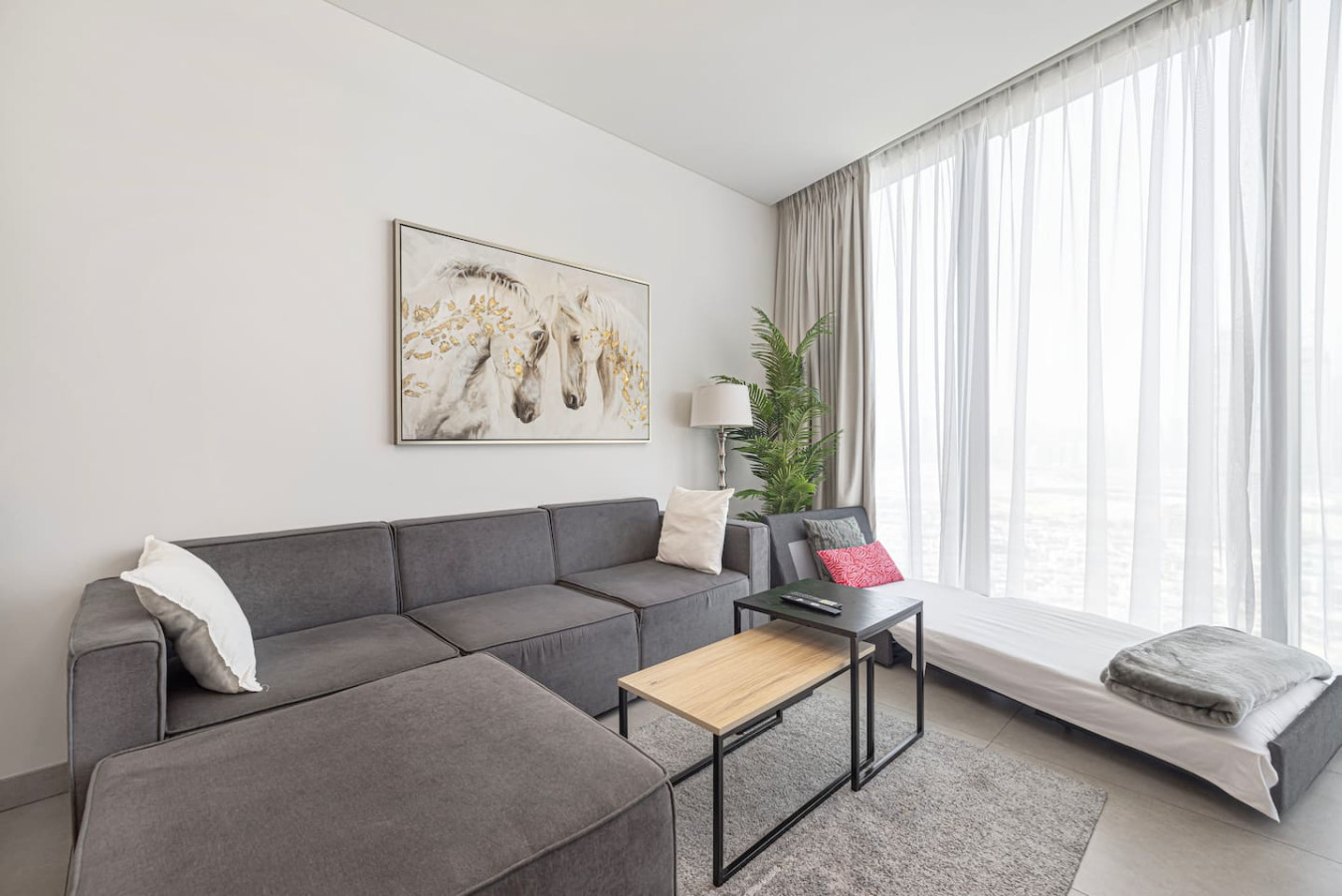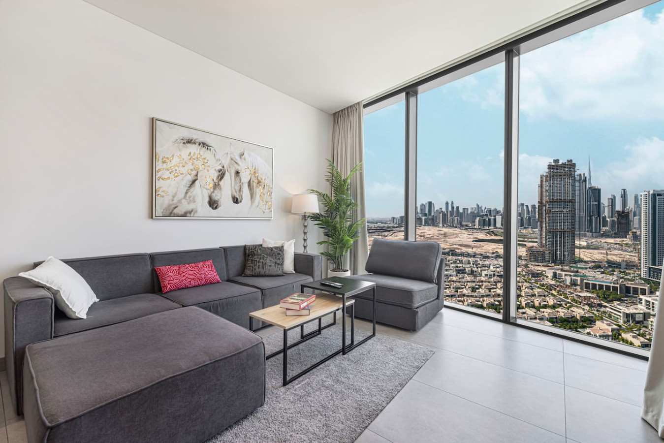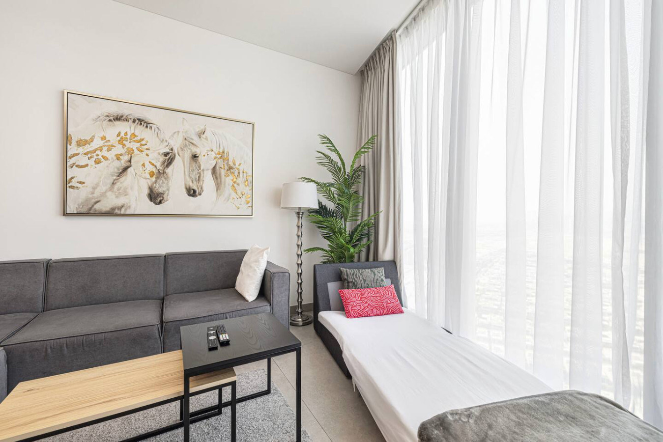 Welcome to your home away from home in the heart of Dubai. This elegant 1-bedroom apartment with single sofa bed in the living room, in the prestigious Waves Grande at Sobha Hartland blends modern comfort with resort-style amenities, creating the perfect stay. Enjoy a fully equipped kitchen, and a cozy bedroom for restful nights. Dive into the infinity swimming pool. Its ideal location provides easy access to key parts of the city. Everything you need right at your doorstep. Welcome to Dubai Home sleep 3 adults+1 child at 33rd floor with uninterrupted, panoramic views of the Dubai skyline. Fully equipped kitchen comes with completely stocked cooking needs including selection of pots, pans, serving dishes, platters, cookie trays and more, refrigerator, oven, sink, dishwasher, microwave, kettle. Our spacious 1-bedroom Dubai apartment is furbished with lovely furniture and decorations would undoubtedly make you feel at home – Brand new furniture and appliances – One bedroom with king bed – Living Room with Sofa Bed and Sofa – Large living area/dining area – Large smart TV in the living room and the bed room – Fully equipped kitchen – Brand NEW high-end GYM – Indoor children's play are – Large balcony -Full amenities, towels, shampoo, coffee, water, tea provided ect. -High Speed internet -Parking space – Two pools with kids play area and Sauna and Gym with free access welcome to Dubai 🙂 Guests have full access to pool, gym and parking is on request in the building. We are always available to support face to face or over the phone . Meydan area Taxi or by walk